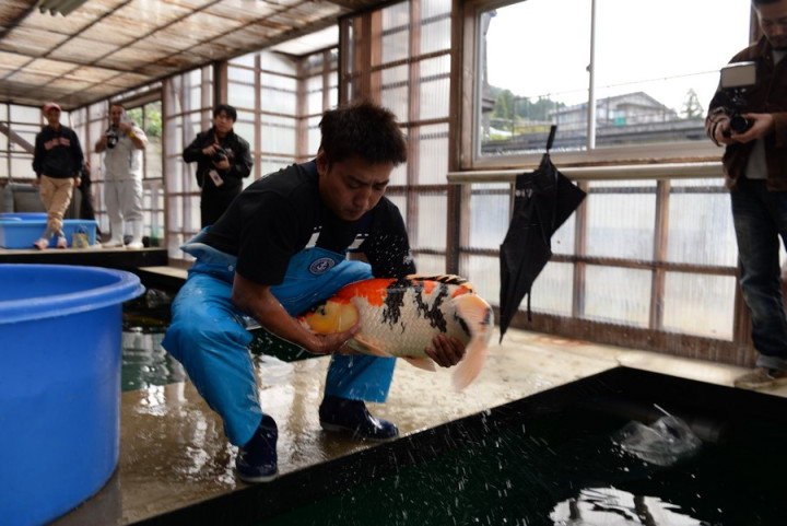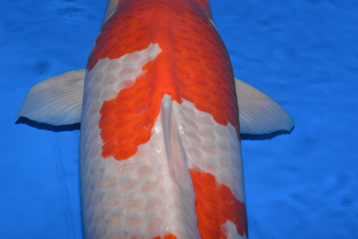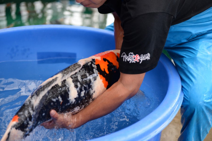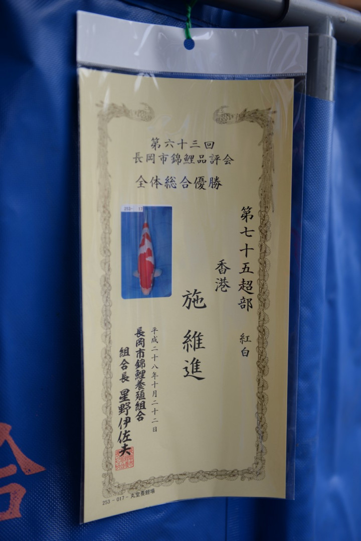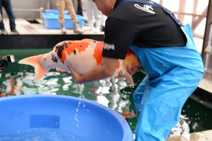 Malheureusement nous arrivons pour la fin et beaucoup de poissons sont déjà repartis chez les éleveurs. Mais par chance, le grand gagnant de cette journée, un Kohaku de Marudo, n'était pas rentré chez lui.