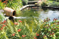 Les plantations dans le bassin sont des nénuphars, des iris jaunes, des renoncules d'eau.