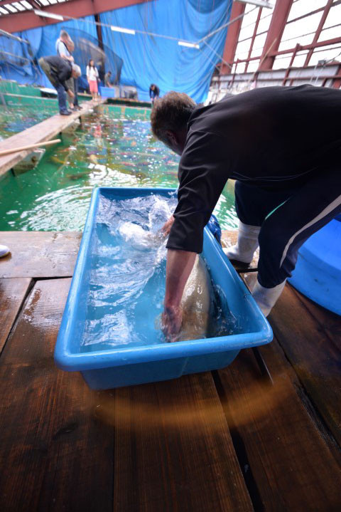 Changement de décor nous voilà au gymnase de Marusei koi farm, les bassins commencent à bien se remplir nous nous concentrons principalement sur un bassin de 20 mètres de long sur 5m de large où se trouvent plus de 400 koï de plusieurs variétés: showa,benigoi,chagoi ginrin,kin matsuba,asagi… de quoi trouver son bonheur avec tout ce petit monde.
