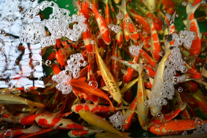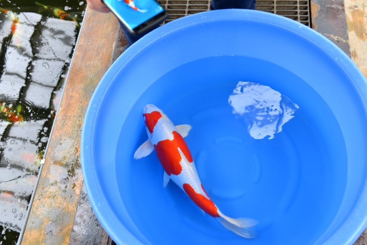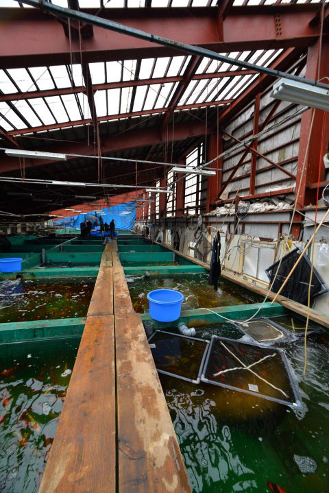 Sa koi farm est divisée en deux bâtiments, dans celui le plus proche de la maison, se trouvent les petits nisai et dans le second les nisai de qualité supérieur et les sansai.
