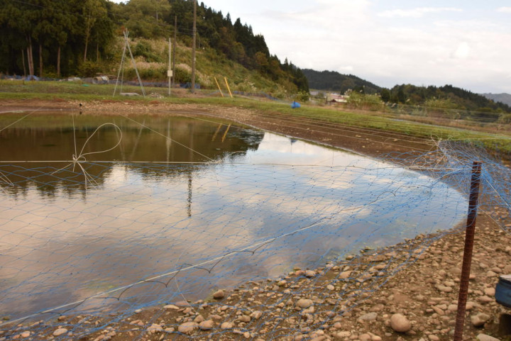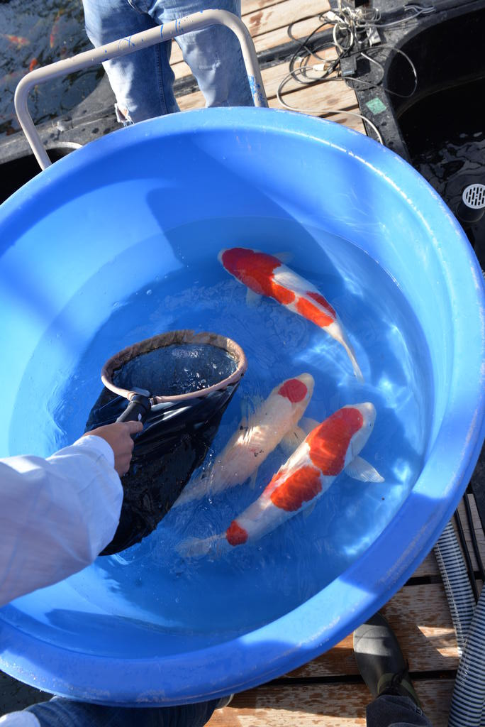 Profitant d’une accalmie passagère nous avons pu faire une sélection de carpe koi de 4 ans dont un kin matsuba et un kohaku tous les deux de 67cm de toute splendeur.
