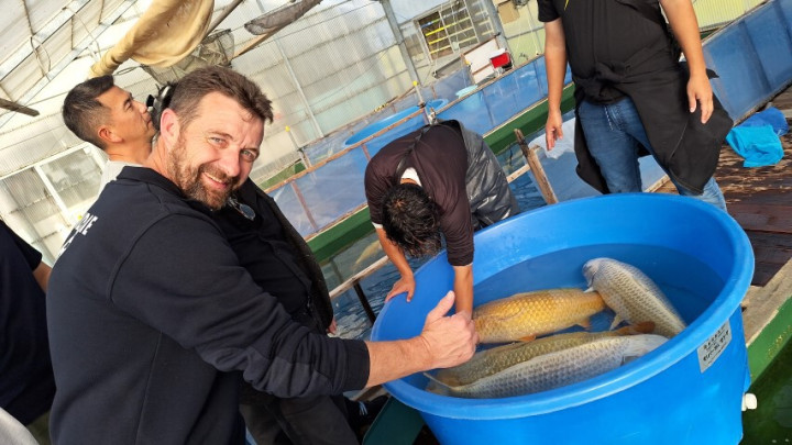 David avait une demande spéciale d'un client en quête d'un grand Koi. Nous avons choisi un ginrin chagoi mesurant 84 cm, âgé de 5 ans.