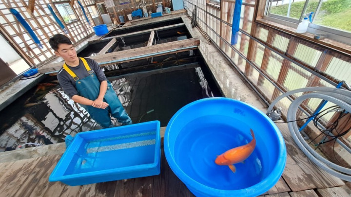 Après cette première sélection, nous partons à la découverte des koi plus âgés, mais aucun ne retient notre attention. C'est donc chez un autre éleveur, Yagenji, que nous poursuivons notre quête.