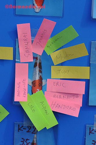 Plusieurs personnes étaient rassemblés autour de quelques piscines où sont présentés des shiro utsuri et kujaku, de différents prix et d'âge. Nous avons 2 heures pour mettre une option sur les koï.