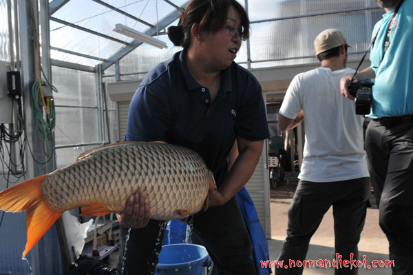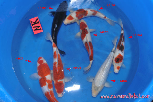 Puis 3 kohaku, 2 kin ki utsuri,1 ginrin kujaku , 1 hariwake nisai taille 30-35cm d'entrée de gamme.