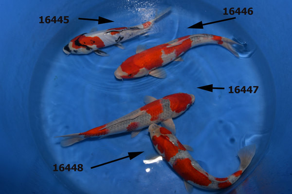 Nous commençons par sélectionner 4 nisais Doitsu purachina,kikokuriu,beni kikokuryu et doitsu kujaku dans une taille de 45/50cm.