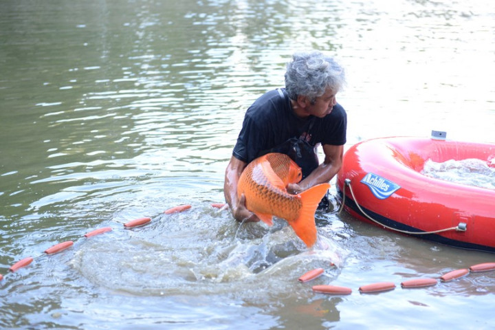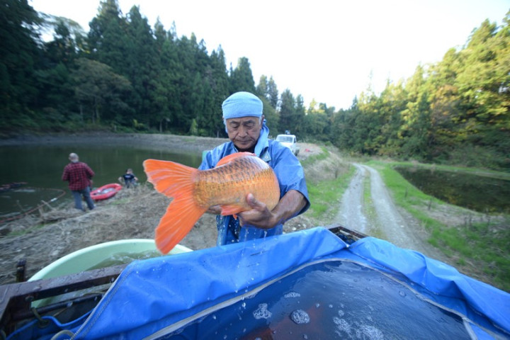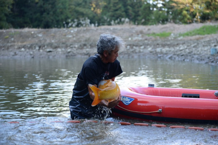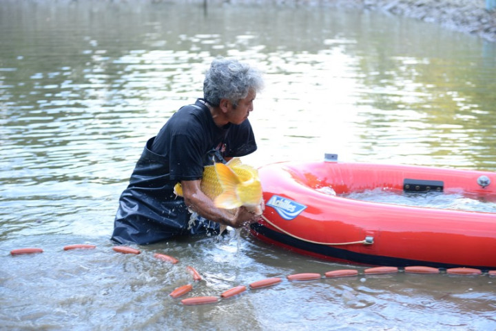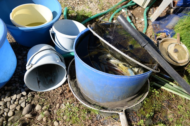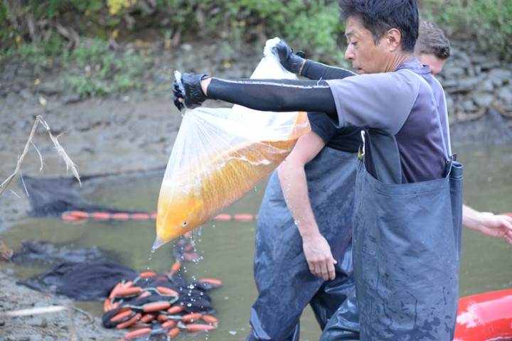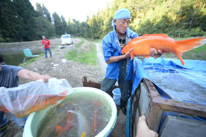 L'ikéage touche à fin , en l'espace de 40 minutes la saine est déployée autour de l'étang, puis chaque koï est déposée dans le bateau gonflable pour ensuite être placée dans la cuve du camion.