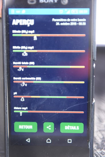 Entre deux pêches, je me permet de faire une analyse d'eau afin de vous donner les informations possibles sur le mud pond qui se trouve derrière cet éleveur, les valeurs sont les suivantes avec le Pro scan de JBL.