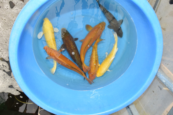Puis un cha-utsuri nisai (2 ans) de 56cm qui viendront compléter le tout, il faut bien penser que le sumi (noir) du koï va foncer dans nos eaux dures de normandie qui va accentuer le motif du pattern.