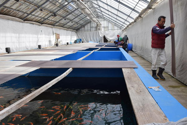 La ferme Maruyama est relativement importante et surprenante par la qualité de ses Kohaku. En effet les kohaku d’un croisement entre du Dainichi et du Kagura beni (tortue de terre, ce qui donne un beni particulier de couleur très orangé avec une force d’écaille importante).