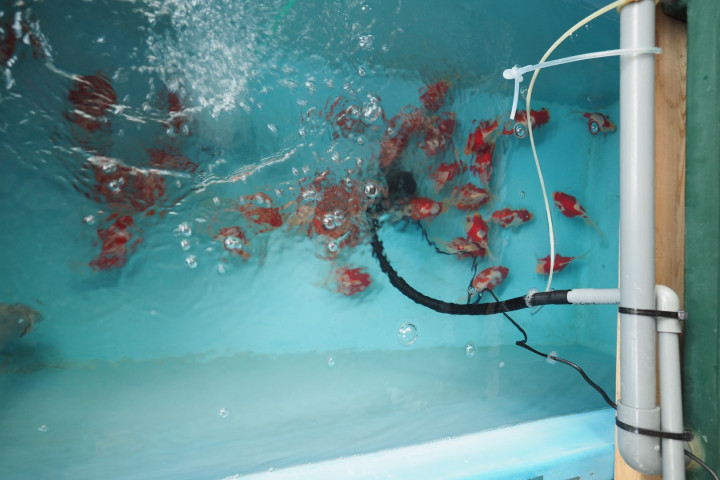 Les frères étant absents et les bacs presque vides, nous avons décidé d’aller visiter un peu plus loin Marushin, un éleveur réputé pour ses Goromo et Tamasaba chez lequel nous avons fait nos premières acquisitions, à savoir trois superbes Ginrin Goromo (un Ai et deux Budo) mais aussi des Doitsu Showa répondant en terme de qualité à notre demande dans les premiers budgets.