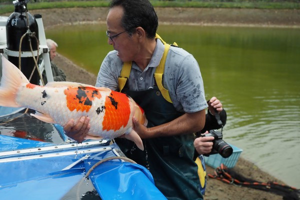Nous avions reçu il y a un mois chez Normandie Koi avant le Koi Show son dirigeant Toshikatsu Sakai. Son père, Toshio Sakai est le créateur de la célèbre lignée Matsunosuke, le premier à avoir créé des Gosanke de plus d’un mètre.