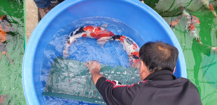 Alors ni une ,ni deux, nous préparons nos bowls afin de faire notre sélection et le bonus en prime l’éleveur nous propose les koïs au fur et à mesure qu’il fait son sembetsu ( sélection en fonction de la valeur) avant de les mettre dans les bassins.