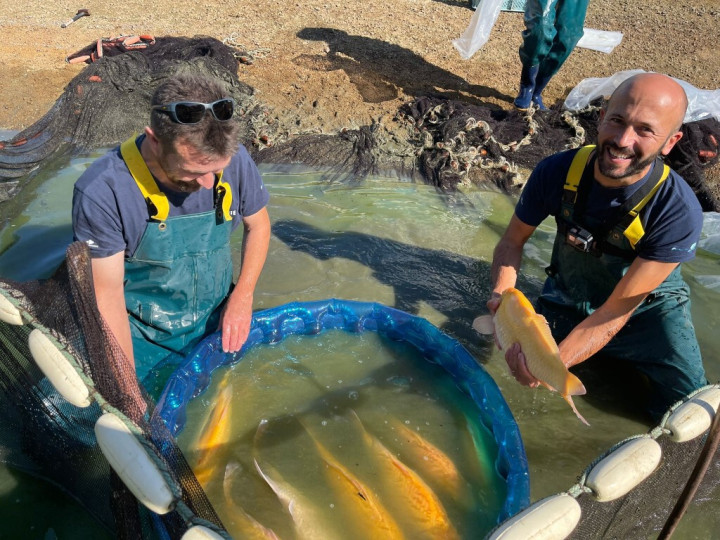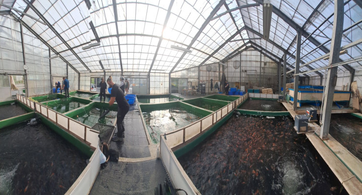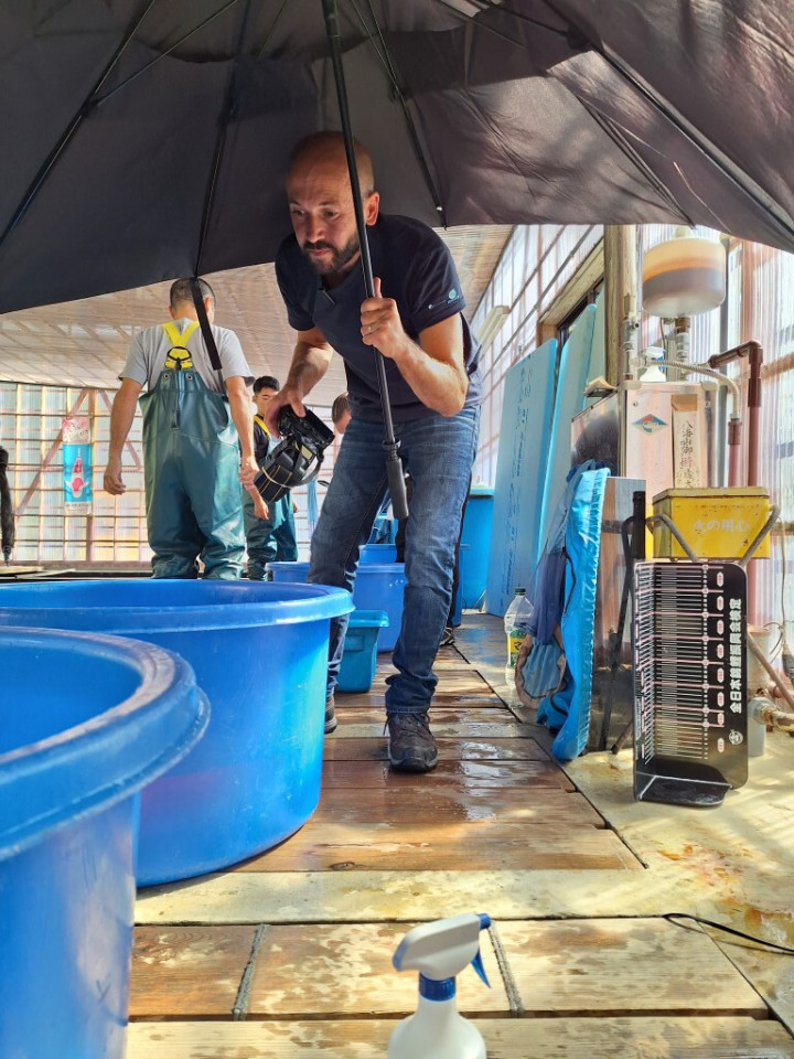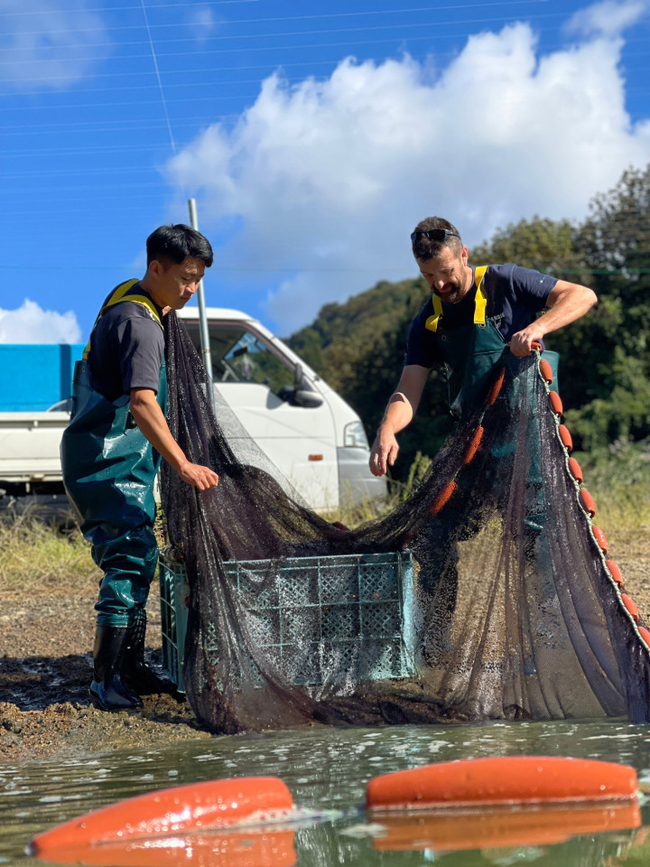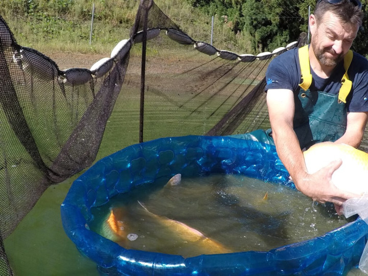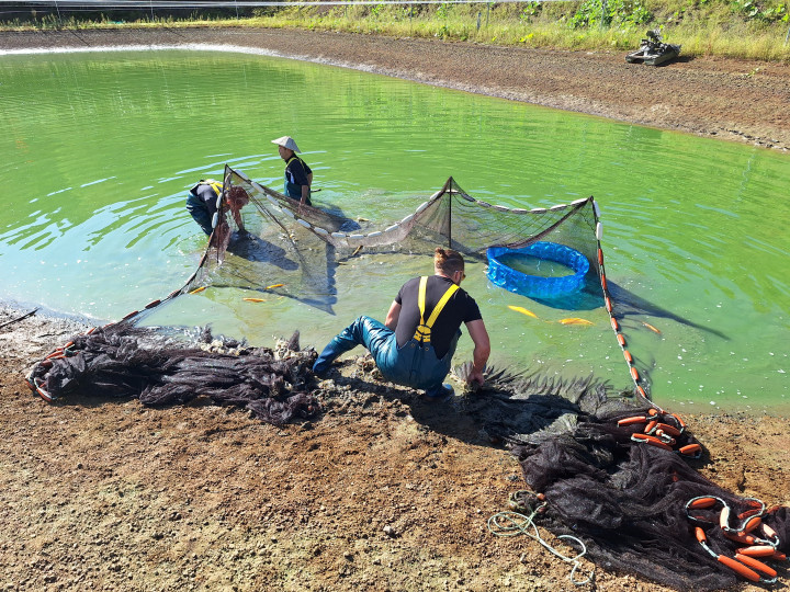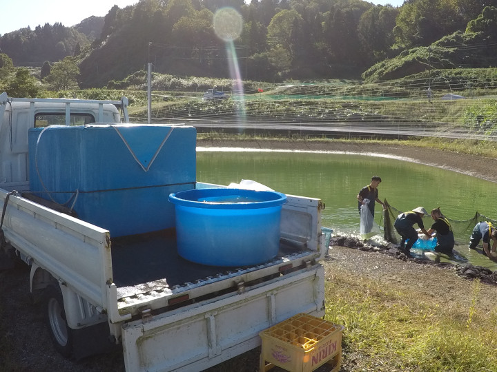 Après quelques efforts pour tirer le filet autour du bassin, nous attrapons en l'espace d'une heure et demie tous les koi afin de les ramener à la ferme.