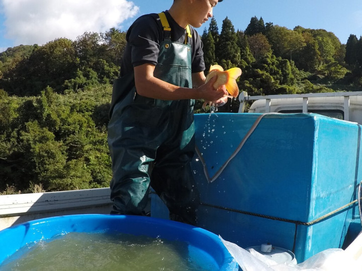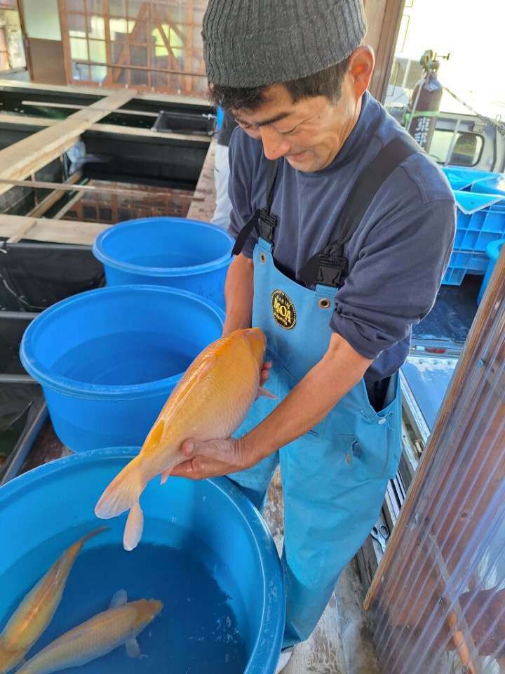 Pendant le tri que font les éleveurs auprès des Karashigoi fraîchement ramenés, nous procédons à une vérification des différents bacs et nous allons sélectionner un Doitsu Sanke avec un beau potentiel d'évolution, mâle, mais aussi un Kikusui que nous avons toujours du mal à trouver.