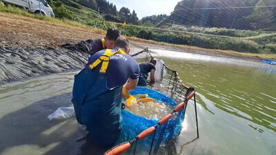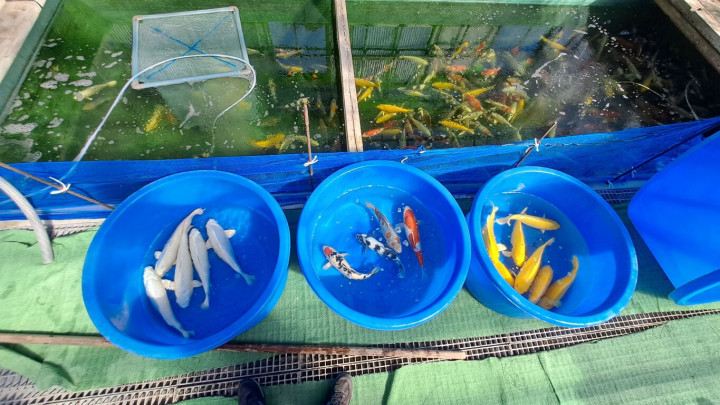 Après une inspection minutieuse de différents bacs, nous prenons le temps de sélectionner 7 koi de 2 ans, affichant une taille d'environ 38-40 cm.