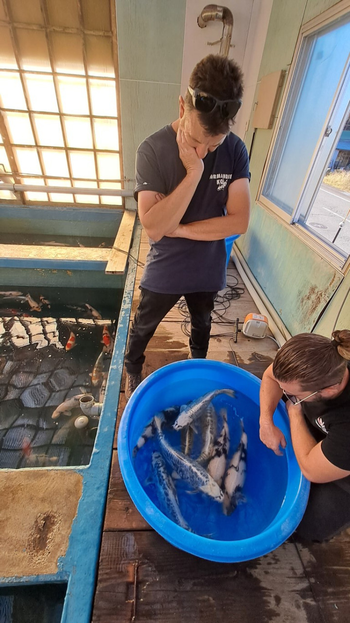 Une fois nos précieuses sélections terminées, notre aventure se poursuit chez un autre éleveur, où nous avons droit à une agréable surprise. Nous y découvrons de magnifiques shiro utsuri et des arakoge de belle taille, mesurant entre 45 et 50 centimètres.