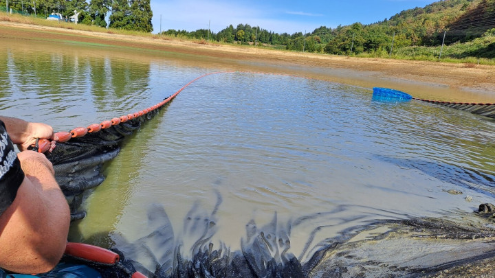 Délicatement nous tirons le filet, extrayant de la boue pas moins de 90 koi, magnifiques karashigoi d'une taille imposante de 45-50 cm et âgés de 2 ans.