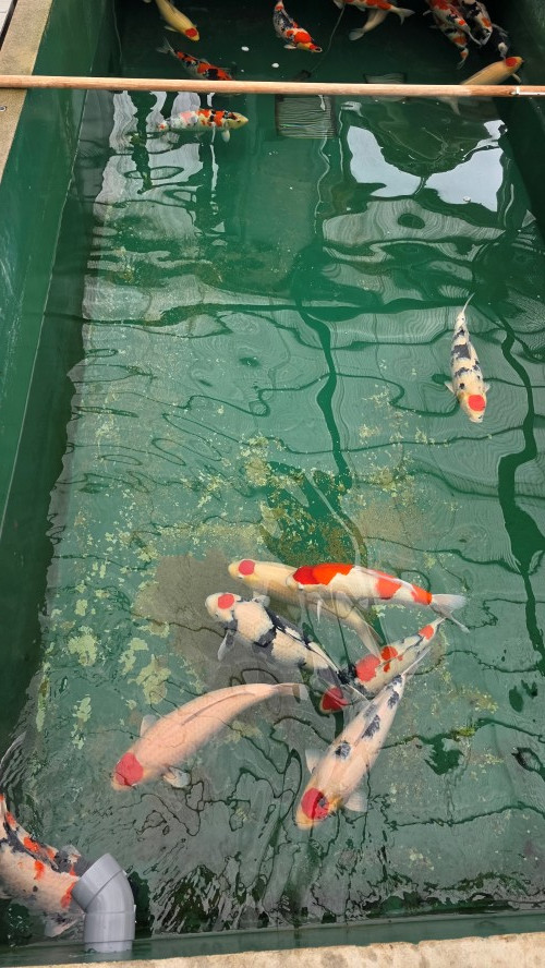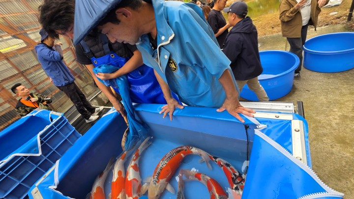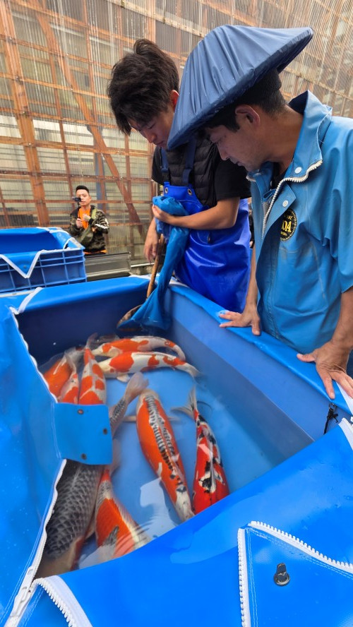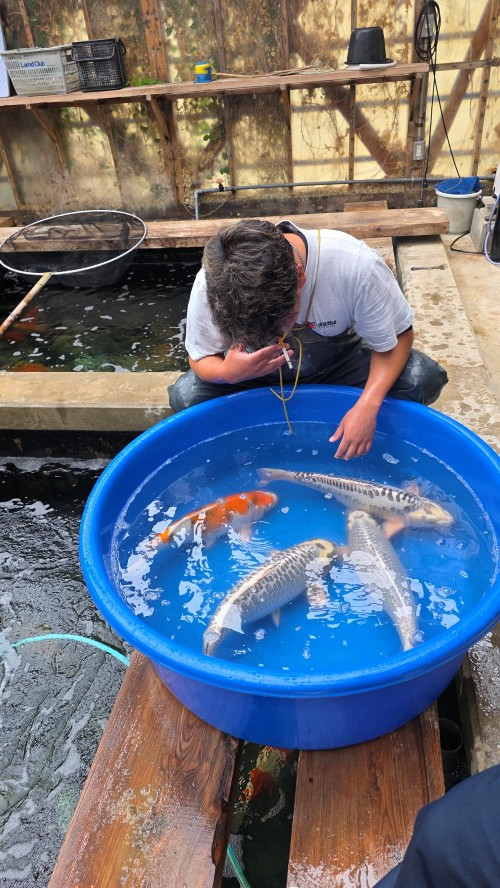 Nous arrivons tôt pour assister à cet événement. Les poissons, soigneusement déplacés d’un bassin à un autre, révèlent des variétés telles que Asagi, Goshiki et Shusui, mesurant en moyenne 60 cm. Malgré la qualité exceptionnelle de ces spécimens, aucune variété ne correspondait à notre sélection actuelle. Nous profitons donc simplement de ce beau moment d’observation.
