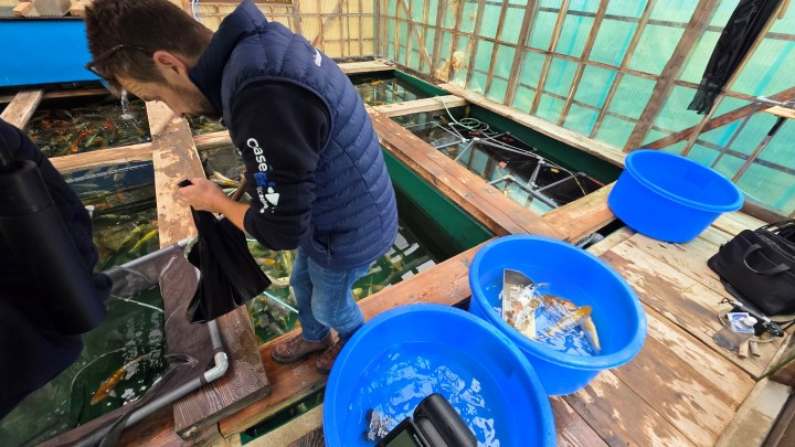 Quelques jours plus tôt, nous avions repéré chez Takahashi de superbes Koi de 3 ans. Cette fois, la sélection s’annonce prometteuse : la lumière met en valeur les reflets métalliques et nacrés des poissons, rendant la tâche encore plus agréable.