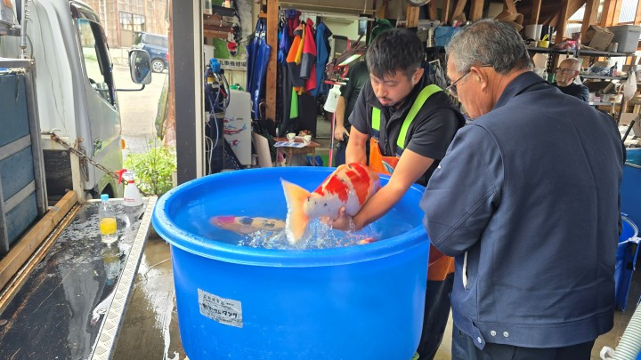 Plus tard, nous faisons halte chez Marujyu, en plein Azukari (retour des koï gardés une année au Japon). L’ambiance était unique : une équipe de télévision japonaise filmait l’événement, témoignage de l’importance de ce moment pour l’éleveur.