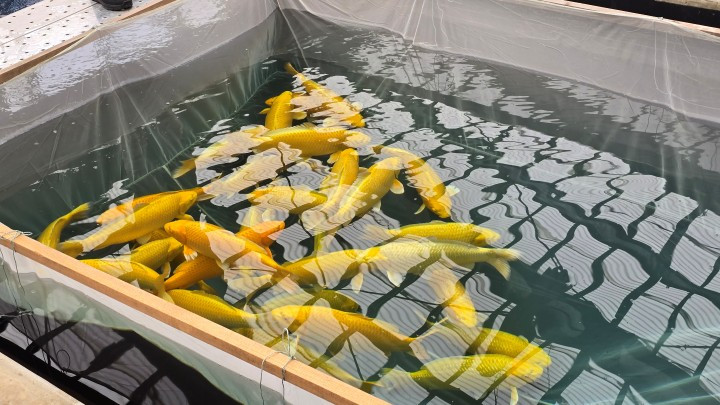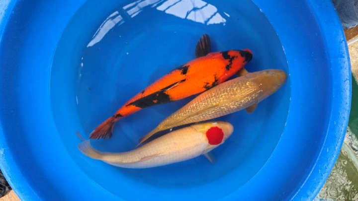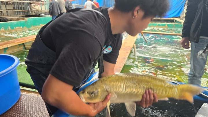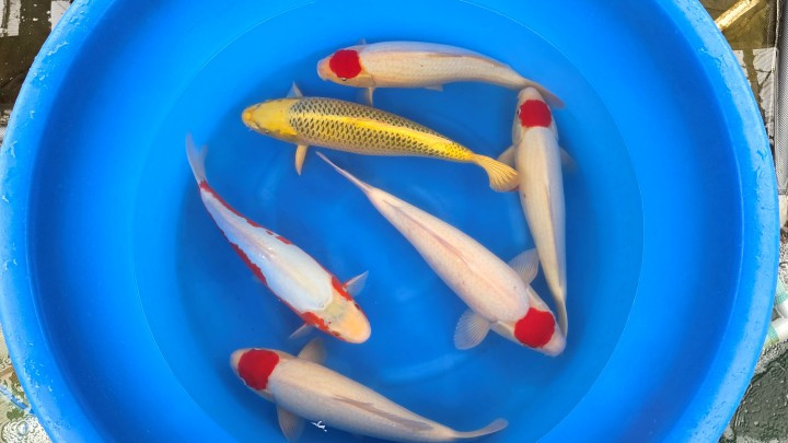 Comme à l’accoutumée, le tirage au sort détermine l’ordre de sélection : cette fois, David tire le numéro 1 ! Nous voilà donc premiers à choisir parmi des dizaines de splendides koï, notamment des Yamabuki Ogon et Ginrin, mesurant entre 55 et 63 cm.