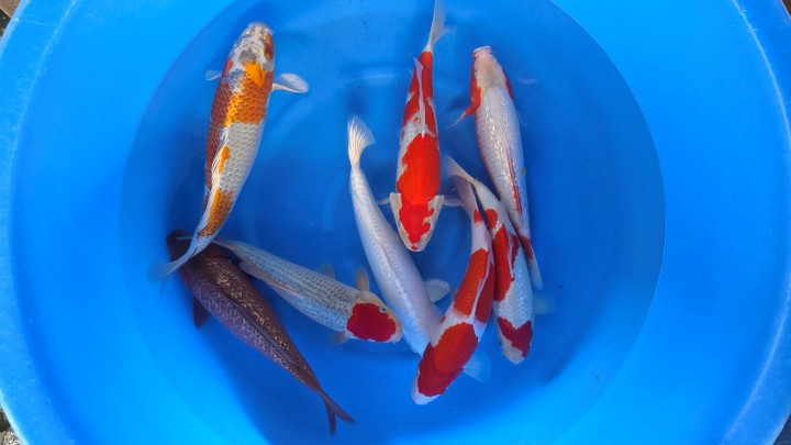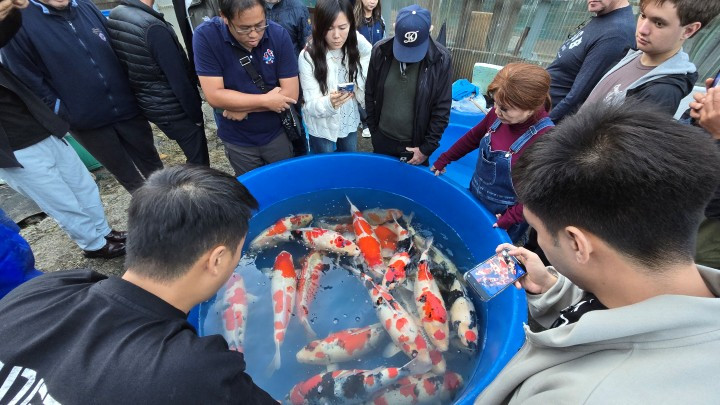 Après cette parenthèse culturelle, nous reprenons la route vers Ikarashi ozumi, où nous procédons à une sélection de nisaï (koï de deux ans). Ces poissons, mesurant entre 40 et 45 cm, présentent des variétés variées, aux couleurs éclatantes et aux motifs harmonieux. Un véritable plaisir pour les yeux et un moment toujours passionnant pour les amateurs de carpes japonaises.