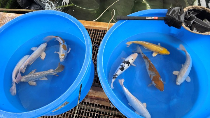 Après un rapide tour d’ensemble de ses bassins, notre attention se porte sur un bassin de qualité intermédiaire, où nous procédons à la sélection de 14 koï aux variétés variées.