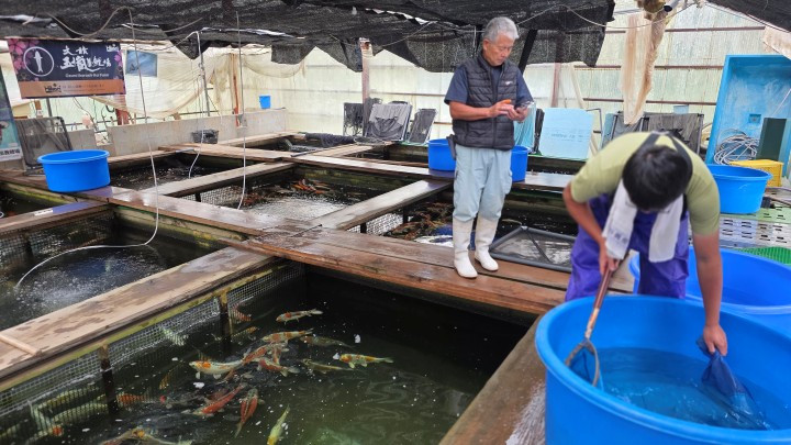 Notre première visite de la journée nous conduit chez Yamazaki, l’un des rares éleveurs japonais spécialisés dans les koï voiles. Très peu d’éleveurs au Japon produisent ces variétés élégantes aux nageoires longues et soyeuses, ce qui en fait des poissons recherchés et peu représentés dans le monde de la carpe koï.