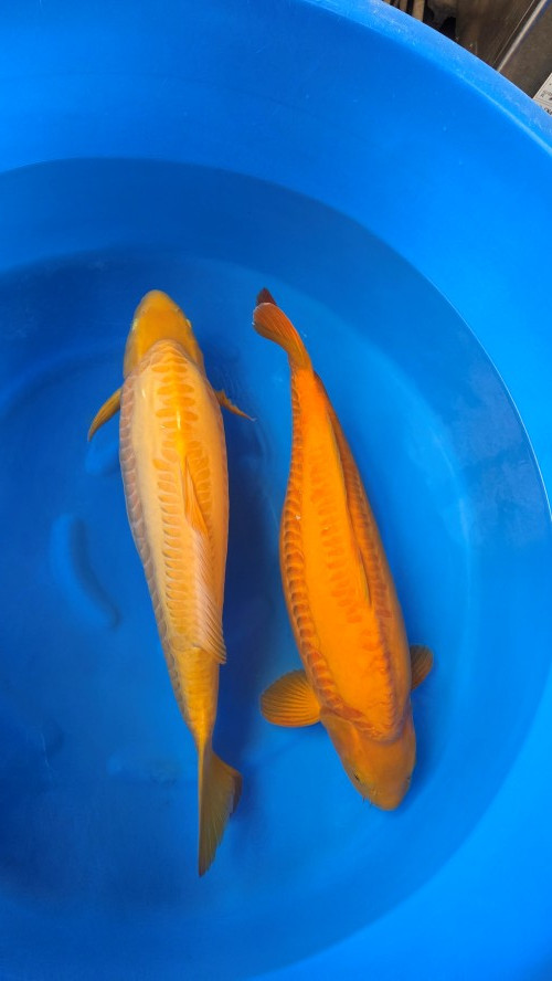 Nous avons également sélectionné deux magnifiques Ki Utsuri de 69 cm, à la morphologie puissante et harmonieuse. Vous pouvez les découvrir en photo ci-dessous.