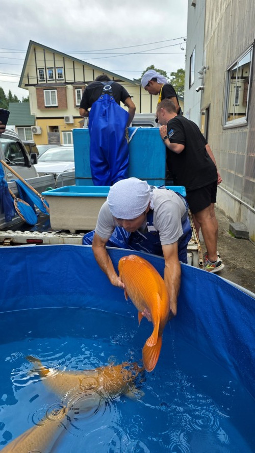Dès la première heure, direction Marusei Koi Farm pour découvrir les nouveaux Koï de 3 ans fraîchement rentrés. Parmi eux, plusieurs Ki Utsuri ont immédiatement attiré notre attention, notamment un spécimen au coloris unique, tirant sur l’orange, au pattern rare et intrigant.